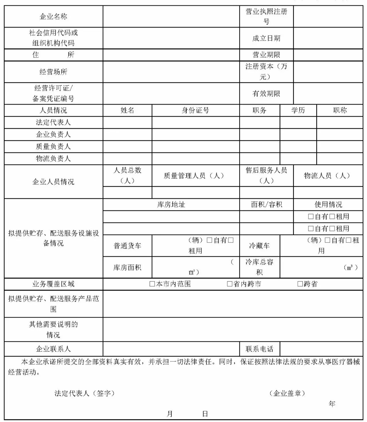 第十九條 擬從事“提供貯存、配送服務(wù)”經(jīng)營(yíng)模式的醫(yī)療器械經(jīng)營(yíng)企業(yè),應(yīng)當(dāng)按照《醫(yī)療器械經(jīng)營(yíng)監(jiān)督管理辦法》、《醫(yī)療器械經(jīng)營(yíng)質(zhì)量管理規(guī)范》及本技術(shù)規(guī)定等相關(guān)要求,向所在地設(shè)區(qū)的市級(jí)食品藥品監(jiān)督管理部門提交《醫(yī)療器械經(jīng)營(yíng)企業(yè)提供貯存、配送服務(wù)基本情況表》(附件1)及相關(guān)資料(詳見附件2),符合要求的,在《醫(yī)療器械經(jīng)營(yíng)許可證》或《第二類醫(yī)療器械經(jīng)營(yíng)備案憑證》的“經(jīng)營(yíng)范圍”項(xiàng)列明“以上范圍可提供貯存、配送服務(wù)”等字樣。