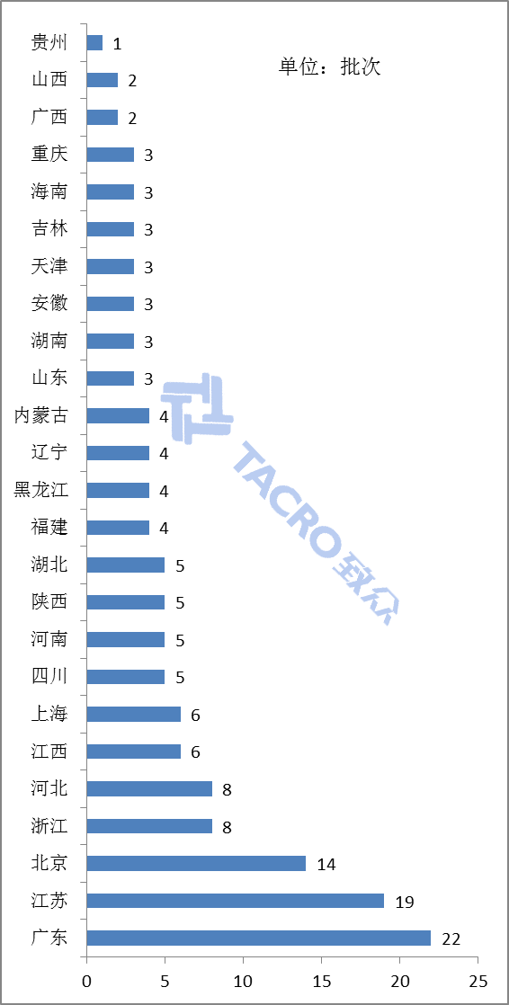 從被抽查單位的地理分布來(lái)看,2018年度抽查到的不符合標(biāo)準(zhǔn)的產(chǎn)品涉及145批次,其中,器械大省(市)廣東、江蘇和北京被抽檢到不符合標(biāo)準(zhǔn)的產(chǎn)品數(shù)最多,分別是22批次、19批次和14批次,浙江、河北、上海等地被抽檢到不符合標(biāo)準(zhǔn)的產(chǎn)品也相對(duì)較多(見圖一)。