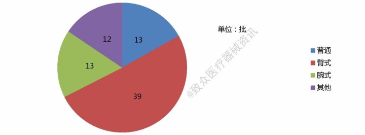 這77款電子血壓計按照類型劃分為普通電子血壓計、臂式電子血壓計、腕式電子血壓計以及其他類電子血壓計四種,可以從圖二看出,臂式電子血壓計不合格數量最多,占總數量的一半。