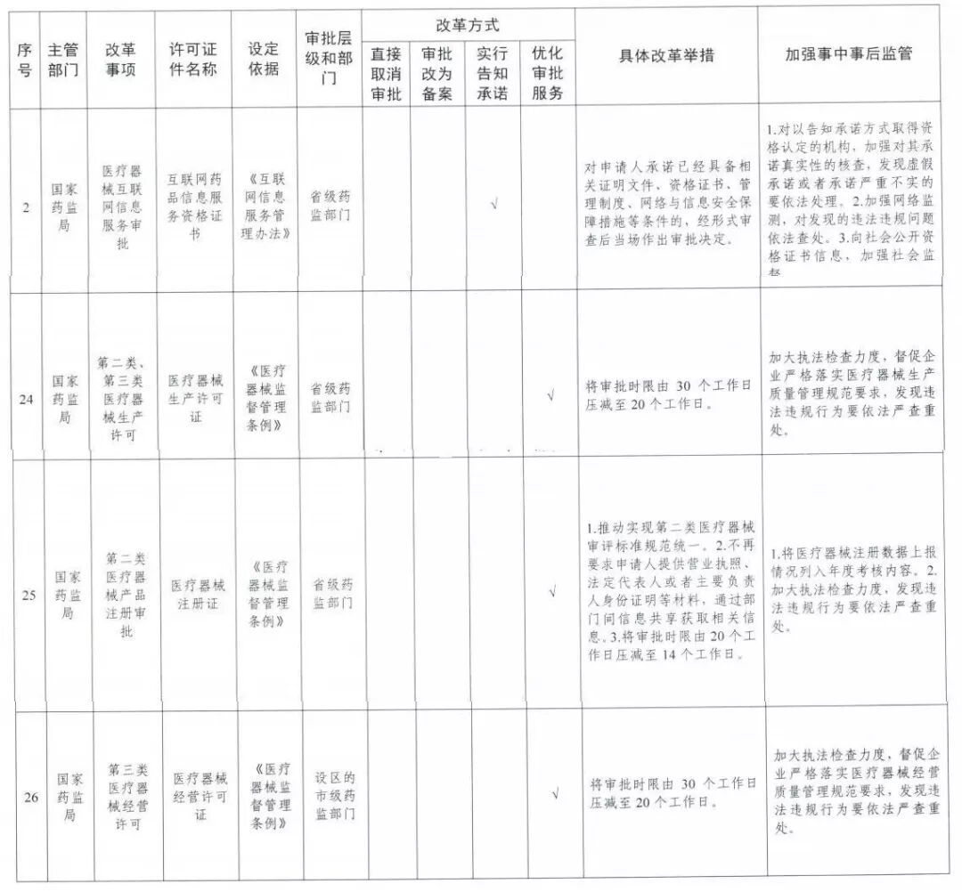 今日,藥監(jiān)局發(fā)布了《國家藥品監(jiān)督管理局貫徹落實國務院在自由貿(mào)易試驗區(qū)開展“證照分離”改革全覆蓋試點實施方案》,試點范圍擴大至18個省,將對一批行政審批事項進行改革,主要為優(yōu)化審評流程、壓縮審評時間。其中涉及到醫(yī)療器械的如下: