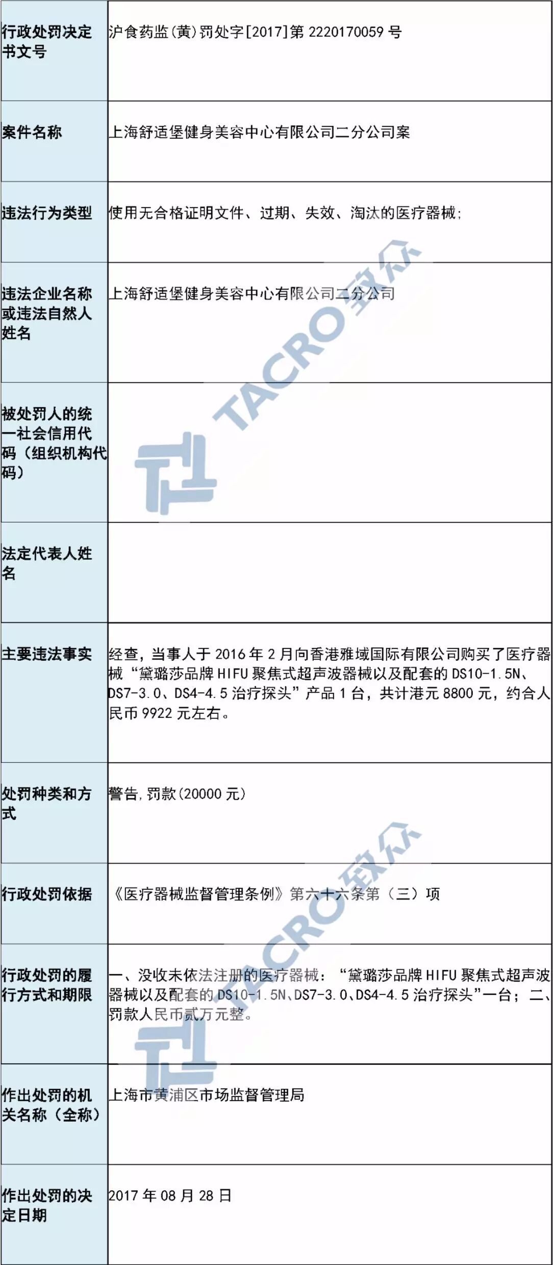 這次遭殃的是3家使用單位——上海麗鉑醫(yī)療美容門診部有限公司、上海思妍麗新天地醫(yī)療美容門診部有限公司、上海舒適堡健身美容中心有限公司二分公司使用未依法注冊的醫(yī)療器械,共被罰款6萬元。