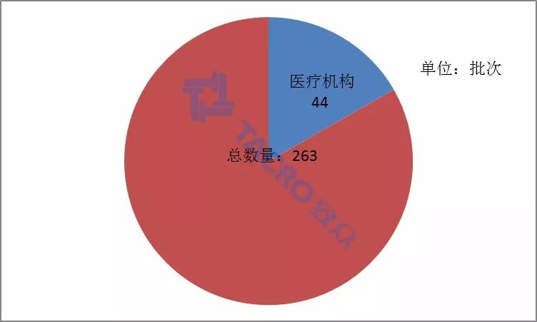 從被抽查單位的性質(zhì)上來看,在這263批次產(chǎn)品中,有44批次產(chǎn)品抽檢于醫(yī)療機(jī)構(gòu)(見圖十二)。