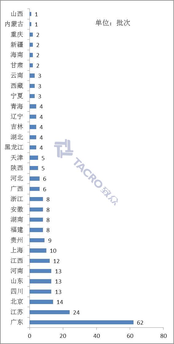 從被抽查單位的地理分布來看,2017年度抽查到的不符合標(biāo)準(zhǔn)的產(chǎn)品涉及263批次,其中,器械大?。ㄊ校V東被抽檢到不符合標(biāo)準(zhǔn)的產(chǎn)品數(shù)最多,涉及62批次,江西、河南、四川等地被抽檢到不符合標(biāo)準(zhǔn)的產(chǎn)品也都在10批次以上(見圖一)。