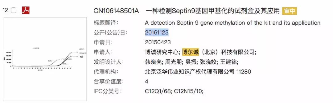 當(dāng)然了,企業(yè)在實際創(chuàng)新申報時要考慮的絕不僅是專利這一個因素,假如根據(jù)研發(fā)管線的進(jìn)度在專利申請之初就預(yù)計創(chuàng)新申報會延后,那這時企業(yè)其實可以選擇專利的延遲公開策略,保證在要申報創(chuàng)新前一個多月時再公開。比如博爾誠公司2017年4月21日獲批的胃癌甲基化基因檢測試劑盒創(chuàng)新批件中的專利申請策略。