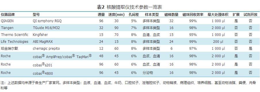 樣本前處理系統(tǒng)依據(jù)其功能的豐富程度又包括自動移液工作站和自動核酸提取儀兩類平臺。自動化移液工作站是一種全自動、高精度移液系統(tǒng)。專門用于小體積的PCR/qPCR體系配置,能夠完全替代手工,保證了配置實驗擴增體系的正確性,精密度以及重復(fù)性,但是因為功能單一,臨床及科研應(yīng)用局限。自動核酸提取儀是集成了自動移液工作站和標(biāo)準(zhǔn)耗材,在儀器預(yù)設(shè)程序控制下進(jìn)行核酸分離的儀器,這一類自動化系統(tǒng)在科研和臨床中應(yīng)用最為廣泛,目前評價分子診斷樣本前處理系統(tǒng)的主要參數(shù)見表2。