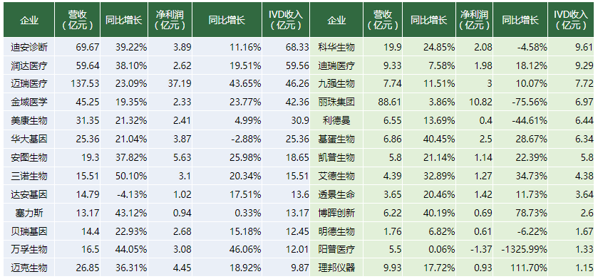 整體來看,IVD企業(yè)增長平穩(wěn),17家企業(yè)營業(yè)收入同比增長超過20%,其中三諾生物、萬孚生物、塞力斯、基蛋生物、博暉創(chuàng)新增長超過40%,迪安診斷、潤達醫(yī)療、安圖生物、邁克生物、艾德生物增長超過30%。