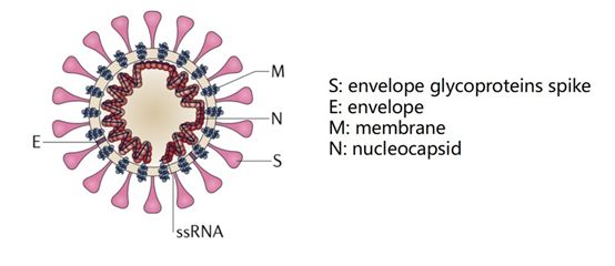 包裹病毒粒子的脂肪膜表面有三個糖蛋白:棘突糖蛋白(S, SpikeProtein,是受體結(jié)合位點、溶細胞作用和主要抗原位點);小包膜糖蛋白(E, EnvelopeProtein,較小,與胞膜結(jié)合的蛋白);膜糖蛋白(M,MembraneProtein,負責營養(yǎng)物質(zhì)的跨膜運輸、新生病毒出芽釋放與病毒外包膜的形成)。少數(shù)種類還有血凝素糖蛋白(HE蛋白,Haemaglutinin-esterase)。