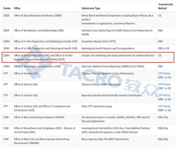 補(bǔ)充:遞交方法因中心和遞交類(lèi)型的不同而不同。下圖中的遞交方法是指如何將遞交內(nèi)容上傳到FDA: 通過(guò)CD/DVD、其他媒介或FDA的電子提交網(wǎng)關(guān)(ESG)。