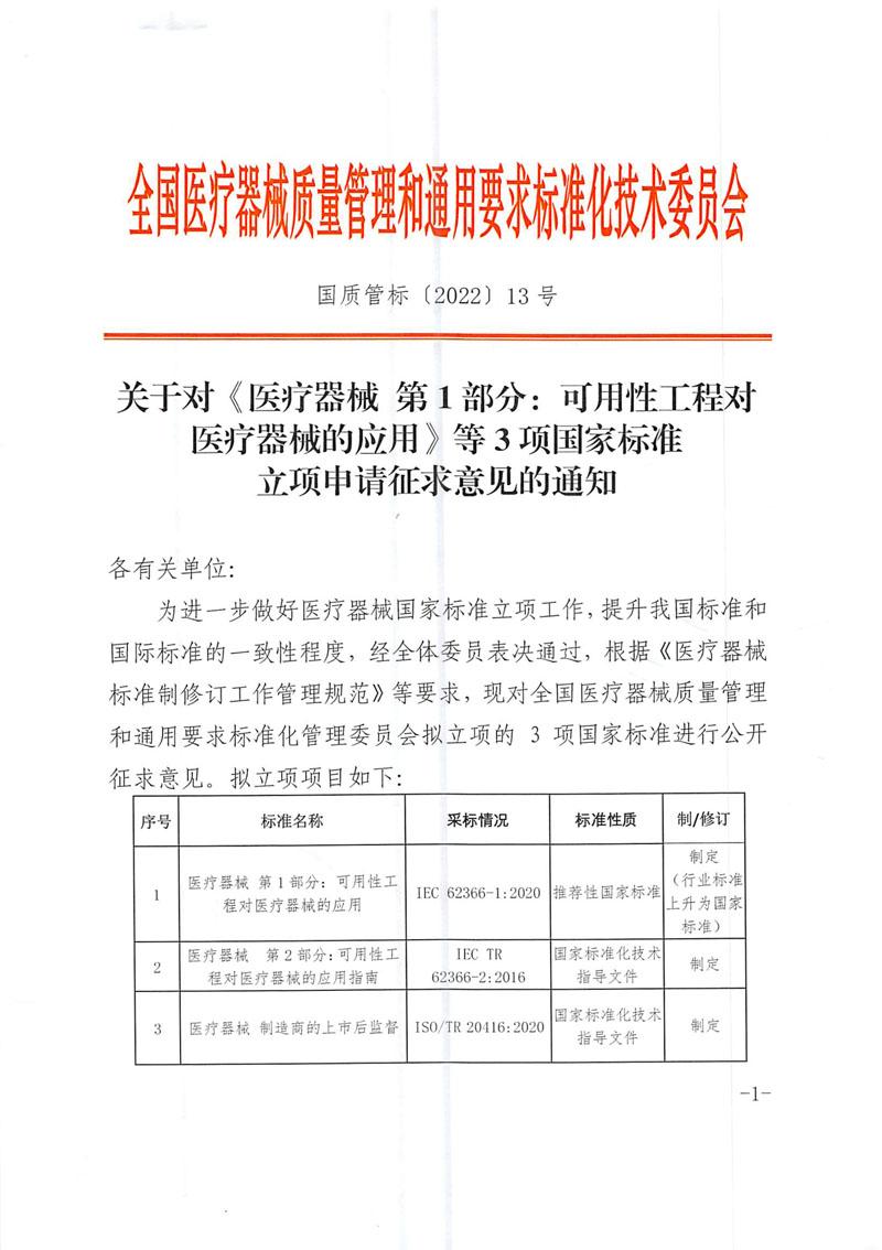 轉(zhuǎn)發(fā)關(guān)于對(duì)《醫(yī)療器械 第1部分:可用性工程對(duì)醫(yī)療器械的應(yīng)用》等3項(xiàng)國(guó)家標(biāo)準(zhǔn)立項(xiàng)申請(qǐng)征求意見(jiàn)的通知