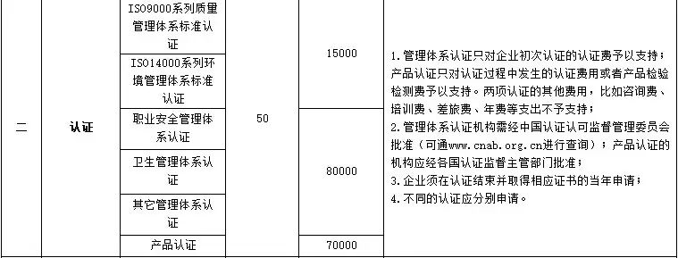 在該通知的內容說明中,對認證項目給予最高50%支持比例,其中管理體系認證支持最高限額為8萬元,產品認證項目最高支持為7萬元。與江西“一視同仁”不同的是,浙江對ISO9001和ISO14001兩項的支持最高限額僅為1.5萬元。