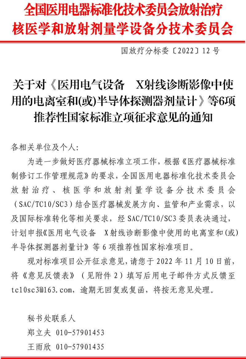 轉(zhuǎn)發(fā)關(guān)于對《醫(yī)用電氣設(shè)備 X射線診斷影像中使用的電離室和(或)半導(dǎo)體探測器劑量計》等6項推薦性國家標準立項征求意見的通知