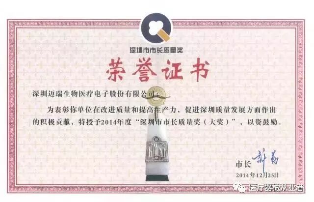 2014年12月31日深圳市質(zhì)量大會在市委召開,國家質(zhì)檢總局副局長陳鋼、深圳市市委書記王榮、市長許勤、深圳市市委常委李華楠等領(lǐng)導(dǎo)出席了本次會議。在會上深圳邁瑞生物醫(yī)療電子股份有限公司獲頒2014年度“市長質(zhì)量獎”大獎,許勤市長親自為公司頒獎。深圳市人民政府于2004年設(shè)立的全市最高質(zhì)量榮譽,授予在質(zhì)量管理和運營績效上成績突出,具有顯著的行業(yè)示范帶動作用,對深圳質(zhì)量建設(shè)做出積極貢獻的企業(yè)、社會組織和公共服務(wù)組織的“深圳市市長質(zhì)量獎”以來,深圳邁瑞生物醫(yī)療電子股份有限公司是深圳市首家獲此殊榮的醫(yī)療器械企業(yè)。