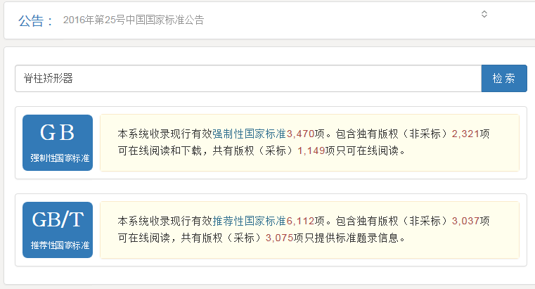 二、選擇 強制性國家標準 或 推薦性國家標準 或 直接在搜索欄輸入 標準名稱\標準號。如 推薦性國家標準 GB/T ,查詢 脊柱矯形器的分類及通用技術(shù)條件