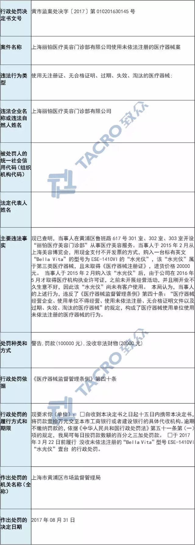 這次遭殃的是3家使用單位——上海麗鉑醫(yī)療美容門診部有限公司、上海思妍麗新天地醫(yī)療美容門診部有限公司、上海舒適堡健身美容中心有限公司二分公司使用未依法注冊的醫(yī)療器械,共被罰款6萬元。