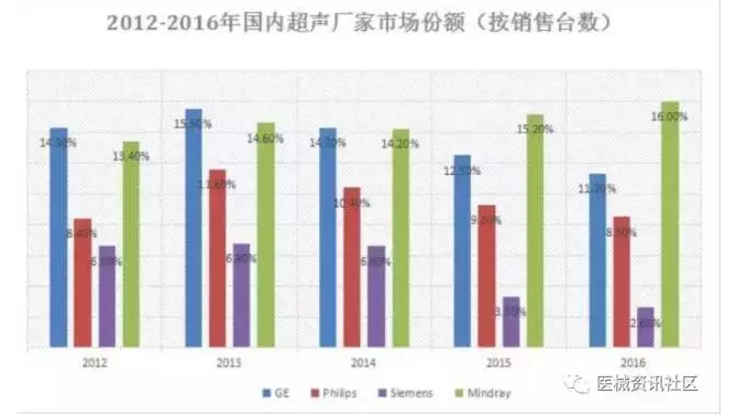 1995年時(shí),中國(guó)的醫(yī)用超聲仍然以黑白超為主,進(jìn)口與合資品牌占主導(dǎo),2005年時(shí),中高端產(chǎn)品依然是進(jìn)口的天下,但中低端的國(guó)產(chǎn)廠商大增、時(shí)至2015年,領(lǐng)先的國(guó)產(chǎn)產(chǎn)品已經(jīng)逐步向中高端彩超進(jìn)發(fā),以邁瑞為例,據(jù)《2012-2016年國(guó)內(nèi)超聲市場(chǎng)份額(按銷售臺(tái)數(shù))》圖表顯示,在2015、2016年邁瑞已經(jīng)反超“GPS”三大醫(yī)療巨頭,成為國(guó)內(nèi)超聲市場(chǎng)的銷量王。2015與2016年邁瑞在國(guó)內(nèi)超聲市場(chǎng)的銷售臺(tái)數(shù)與銷售收入分別兩次超越GE超聲、西門子超聲,宣告了進(jìn)口品牌GPS陣營(yíng)土崩瓦解,邁瑞闖入國(guó)際一流品牌陣營(yíng),形成GPM新三國(guó)時(shí)代